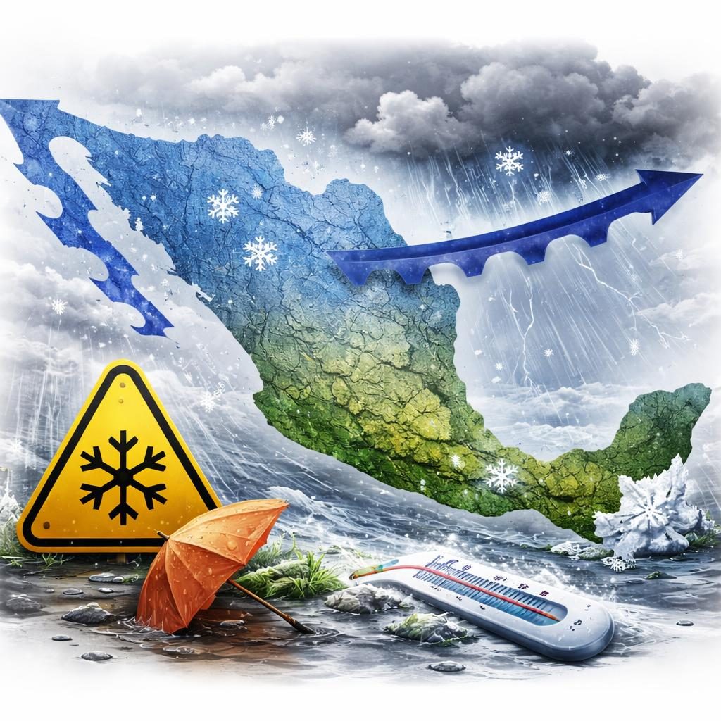 La Coordinación Nacional de Protección Civil (CNPC) informó que, aunque el Frente Frío Número 32 se desplaza hacia el Caribe, su masa de aire ártico continuará generando temperaturas bajas en gran parte del territorio nacional. De manera simultánea, el ingreso de humedad del Océano Pacífico incrementará la probabilidad de precipitaciones en el sur y occidente del país. El Servicio Meteorológico Nacional pronostica para este domingo un ambiente gélido con temperaturas extremas en Chihuahua, Coahuila, Nuevo León, Zacatecas y San Luis Potosí. Se espera frío a muy frío con neblina en zonas del norte, noreste, oriente, centro y sureste. Se prevén lluvias fuertes en Veracruz, Tabasco, Oaxaca y Guerrero; chubascos en Tamaulipas, San Luis Potosí, Hidalgo, Puebla, Chiapas y estados del occidente y centro. Además, se pronostica un evento de 'Norte' con vientos fuertes en Yucatán, Quintana Roo, Veracruz y Tabasco. La CNPC recomienda a la población utilizar ropa abrigadora adecuada (sistema de capas), cubrir nariz y boca al salir para evitar cambios bruscos de temperatura. Ante la presencia de bancos de niebla en carreteras del centro y oriente se insta a los conductores a reducir la velocidad y mantener las luces encendidas. En los estados con pronóstico de lluvias fuertes se exhorta extremar precauciones por riesgo de deslizamientos e incremento en niveles de ríos; también se deben atender las restricciones de navegación emitidas para el Golfo de México y Mar Caribe debido al evento meteorológico. La dependencia hace un llamado a mantenerse informado a través de sus canales oficiales y los reportes de la Conagua.