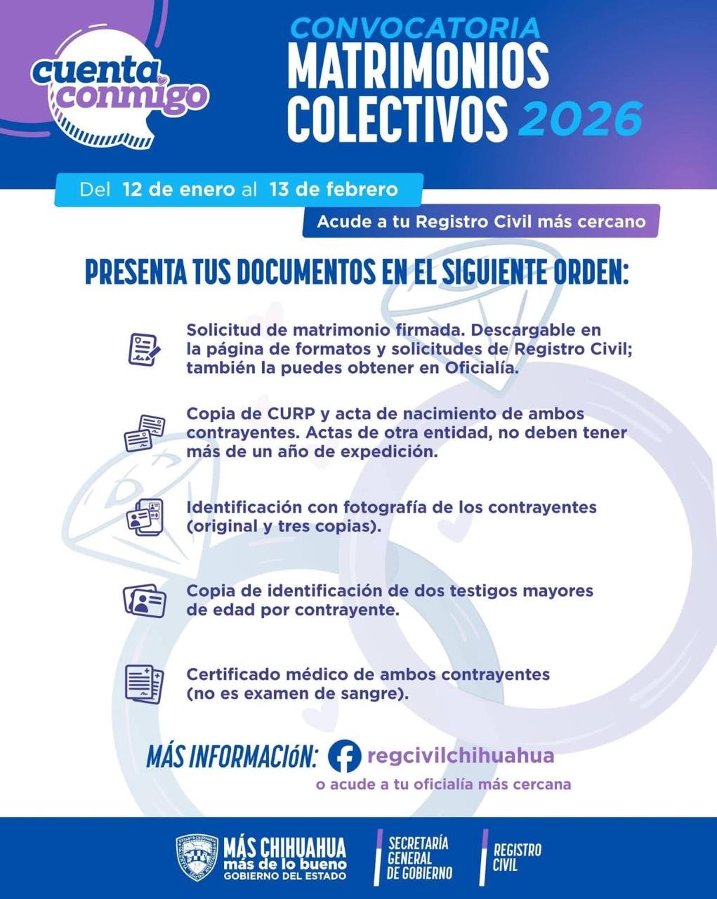 El Gobierno del Estado informó que el próximo 13 de febrero es la fecha límite para que las parejas interesadas se inscriban en el programa Matrimonios Colectivos 2026. Jorge Chávez Delgado, oficial del Registro Civil en Parral, detalló que hasta el momento hay 73 parejas inscritas para la ceremonia, la cual se realizará el 26 de febrero a las 16:00 horas en la Antigua estación del ferrocarril. Los requisitos incluyen presentar la solicitud de matrimonio firmada, copia de CURP y Acta de Nacimiento de ambos contrayentes (con vigencia menor a un año si son de otra entidad), identificación oficial con fotografía original y tres copias, copia de identificación de dos testigos mayores de edad por contrayente y certificado médico de ambas partes. La solicitud puede obtenerse en la Oficialía correspondiente o descargarse del sitio web del Registro Civil. Para más información, se puede consultar la página de Facebook RegcivilChihuahua o acudir a la oficialía más cercana. En Parral, el Registro Civil está ubicado en el edificio de Gobierno del Estado, primer piso, avenida 20 de Noviembre número 2, colonia Centro.