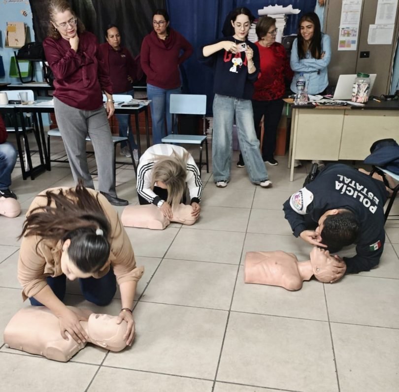 Durante la sesión, las y los maestros aprendieron procedimientos esenciales como reanimación cardiopulmonar (RCP), control de hemorragias, atención primaria de quemaduras y maniobras para desobstruir vías aéreas. Estos conocimientos buscan preservar la vida de estudiantes o cualquier persona afectada mientras se espera la llegada de atención médica especializada.