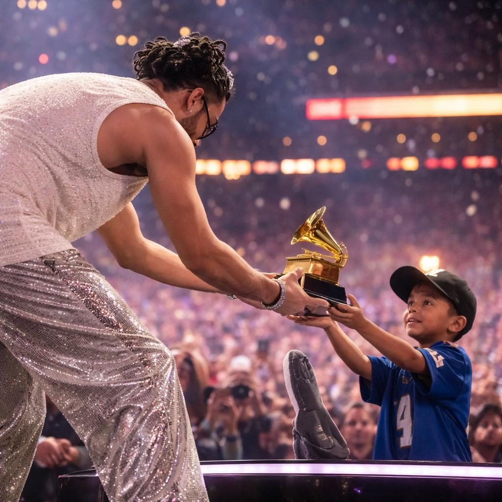 Durante su presentación en el espectáculo de medio tiempo del Super Bowl LVIII, Bad Bunny protagonizó un momento simbólico al entregar un premio Grammy a un niño en el escenario. El hecho generó especulaciones en redes sociales sobre la identidad del menor.