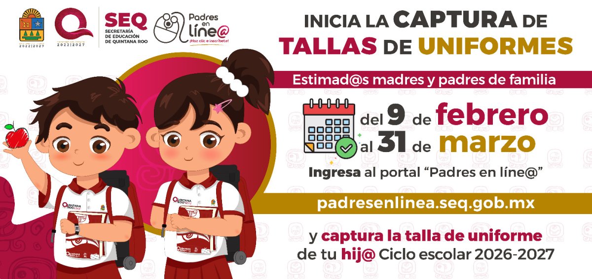 La Secretaría de Educación de Quintana Roo (SEQ) inició el proceso de captura de tallas para los uniformes escolares que se entregarán a estudiantes de escuelas públicas en el ciclo escolar 2026-2027. El periodo de registro estará abierto del 9 de febrero al 31 de marzo del presente año, dirigido a alumnos de preescolar, primaria y telesecundaria.