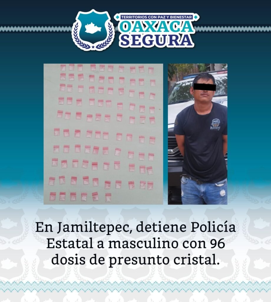 Elementos de la Policía Estatal de Oaxaca detuvieron a un hombre de 33 años, identificado como J. L. M. M., tras asegurarle 96 dosis de una sustancia con apariencia de cristal, durante un operativo realizado en el municipio de Santiago Jamiltepec. Los hechos ocurrieron el 16 de febrero de 2026 en la calle Manuel Negrete, ubicada en la región de la Costa del estado.