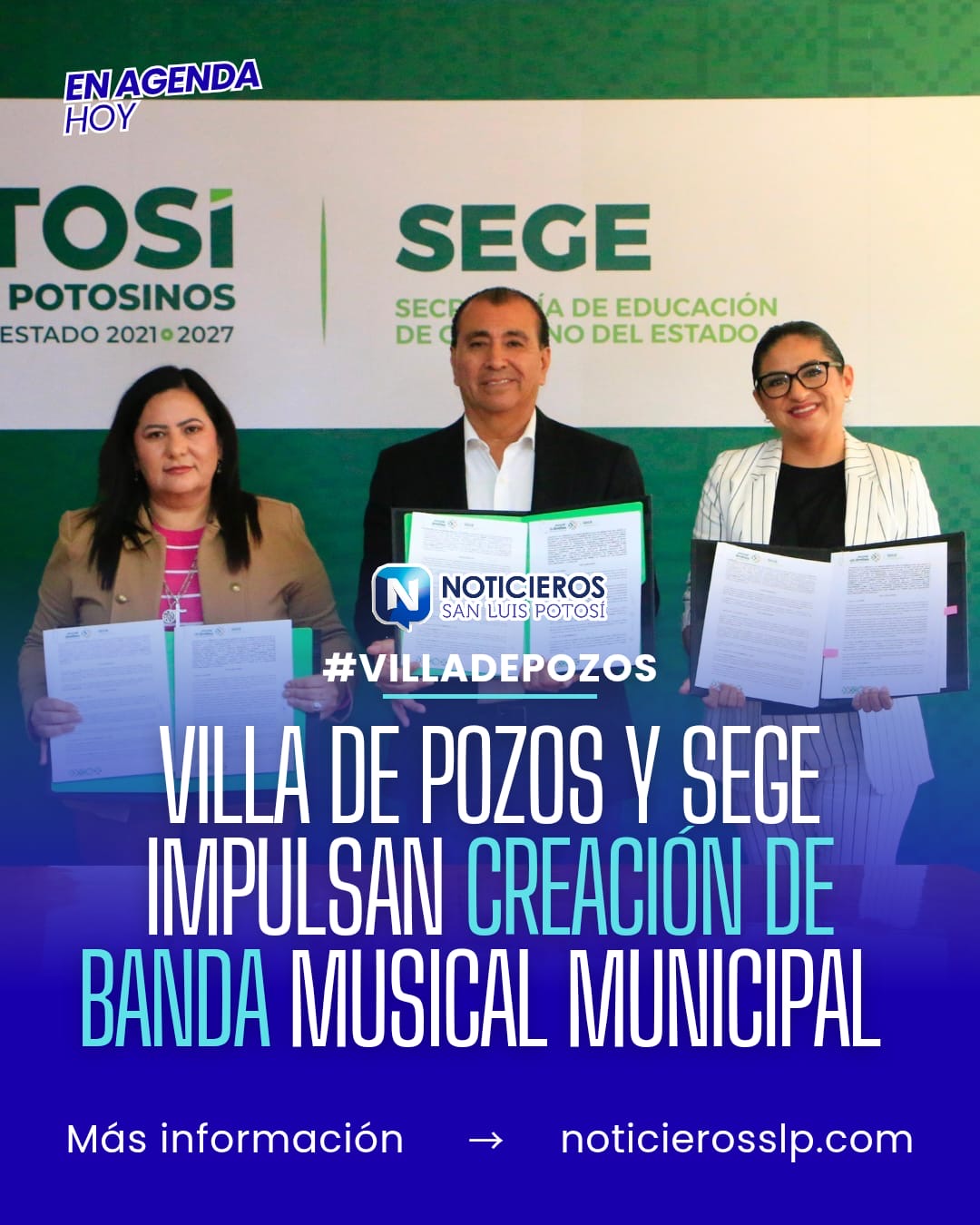El Gobierno Municipal de Villa de Pozos y la Secretaría de Educación de Gobierno del Estado (SEGE) firmaron un convenio de colaboración para el comodato de instrumentos musicales. El acuerdo tiene como objetivo principal impulsar la cultura y fortalecer la formación artística en el municipio, facilitando el acceso a la música para la población.