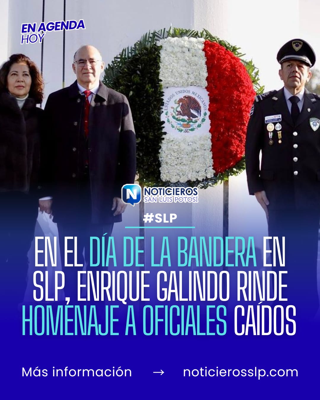 Durante la ceremonia oficial por el Día de la Bandera en San Luis Potosí, el alcalde Enrique Galindo Ceballos rindió homenaje a los elementos del Ejército y de la Guardia Nacional que perdieron la vida en cumplimiento de su deber el pasado domingo. El acto se desarrolló en el asta bandera ubicada al poniente de la ciudad capital, donde se realizaron honores e izamiento del lábaro patrio.