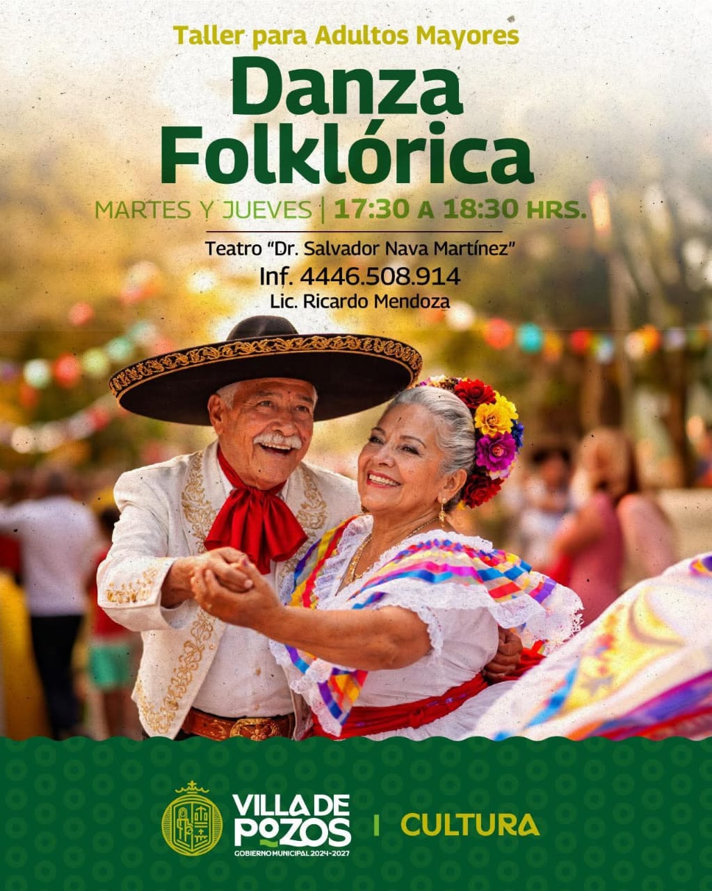 La Dirección de Cultura Municipal de Villa de Pozos ha abierto la convocatoria para un taller de danza folklórica dirigido exclusivamente a personas adultas mayores. La actividad, que no requiere experiencia previa, se desarrollará en el Teatro Municipal ‘Dr. Salvador Nava Martínez’ los días martes y jueves, en horario de 17:30 a 18:30 horas.