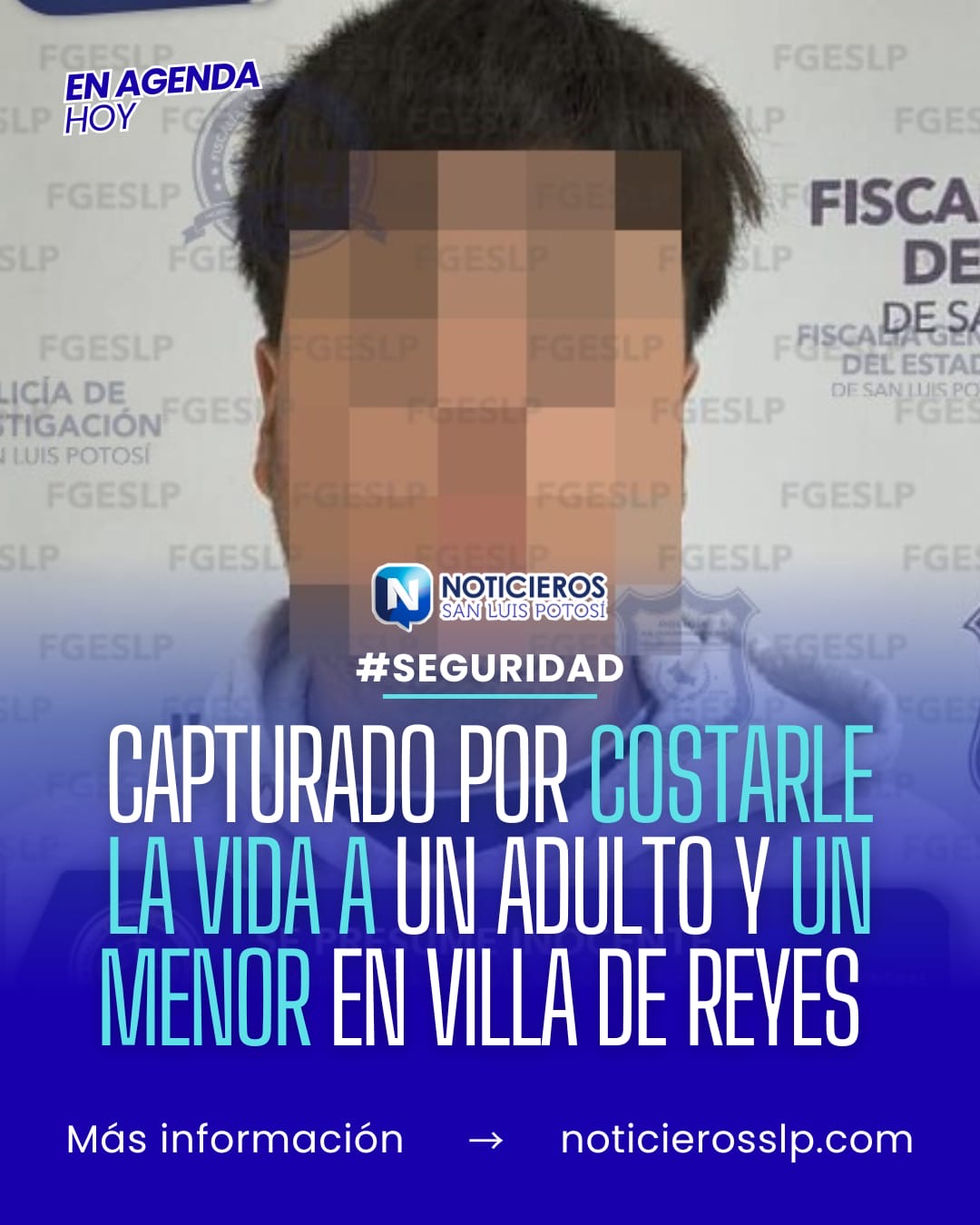 La Fiscalía General del Estado de San Luis Potosí (FGESLP) informó sobre la detención de un individuo señalado como probable responsable de un doble homicidio ocurrido en el municipio de Villa de Reyes. Los hechos, que habrían tenido lugar en noviembre de 2025, involucran la muerte de una persona adulta y un menor de edad, así como un intento de homicidio contra otra persona.