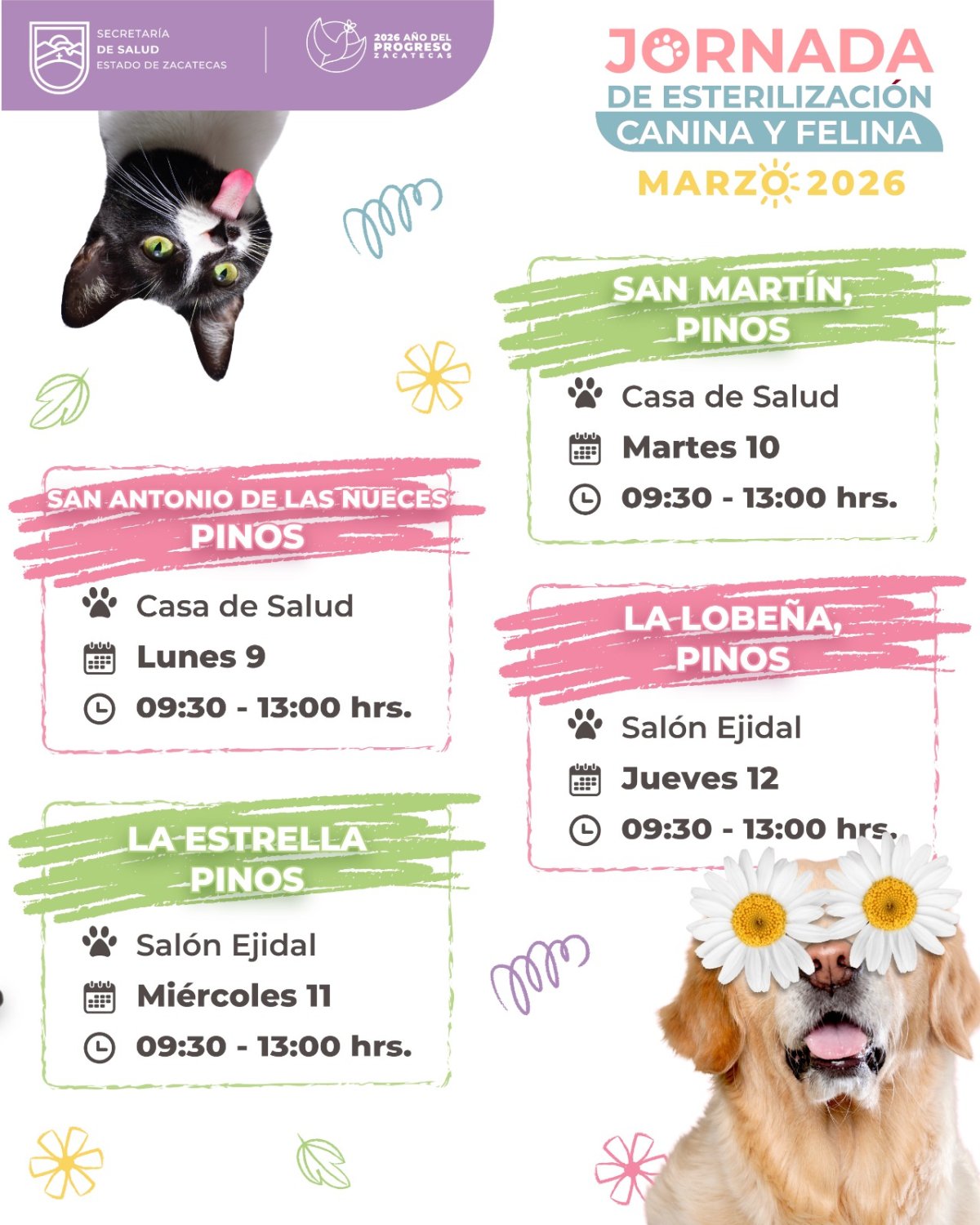 El Gobierno del Estado de Zacatecas, mediante la Secretaría de Salud (SSZ), ha puesto en marcha una jornada de cirugías gratuitas para la esterilización de perros y gatos en el municipio de Pinos. Esta iniciativa forma parte de una estrategia para acercar servicios de calidad a todas las regiones del estado.
