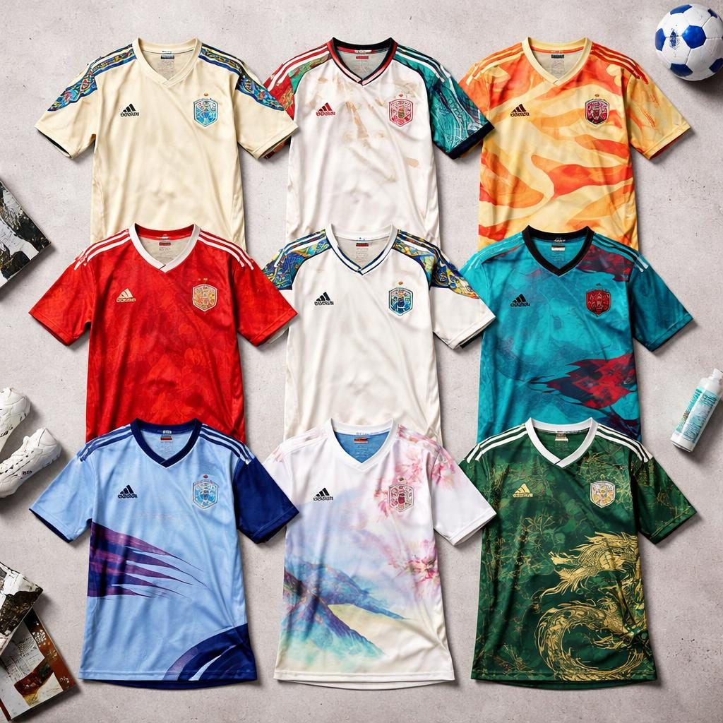 La propuesta de España se inspira en la literatura clásica, utilizando tonos beige y crema que evocan páginas antiguas, con detalles que remiten a manuscritos y acentos en rojo. Alemania, por su parte, opta por una camiseta azul oscuro con un degradado de puntos que forma sutilmente un águila, símbolo nacional, combinado con detalles en los colores de su bandera.