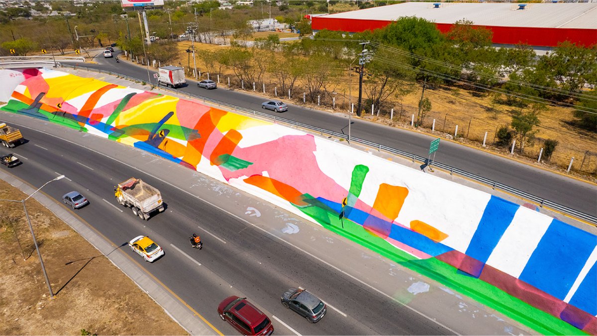 El mural de MadC, ubicado en la intersección de la Avenida Miguel de la Madrid y Día del Empresario en Ciudad Guadalupe, es el más extenso de este corredor, abarcando una superficie de mil 100 metros cuadrados. La obra ya está disponible para ser vista por automovilistas y transeúntes en esa zona del área metropolitana de Monterrey.