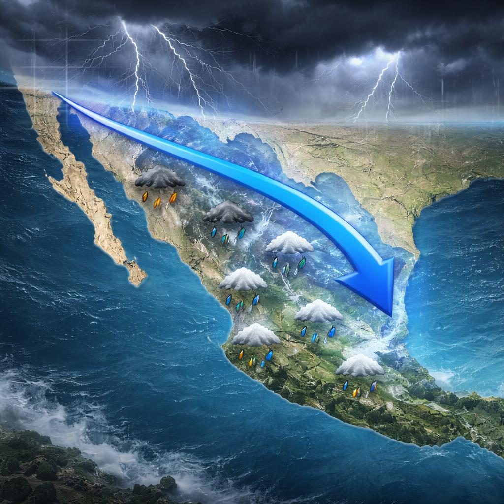 Además del frente frío, la interacción con otros sistemas mantendrá lluvias en el oriente, sur y sureste del país, la Península de Yucatán y las regiones centro y occidente. Estas precipitaciones podrían acompañarse de descargas eléctricas y caída de granizo.