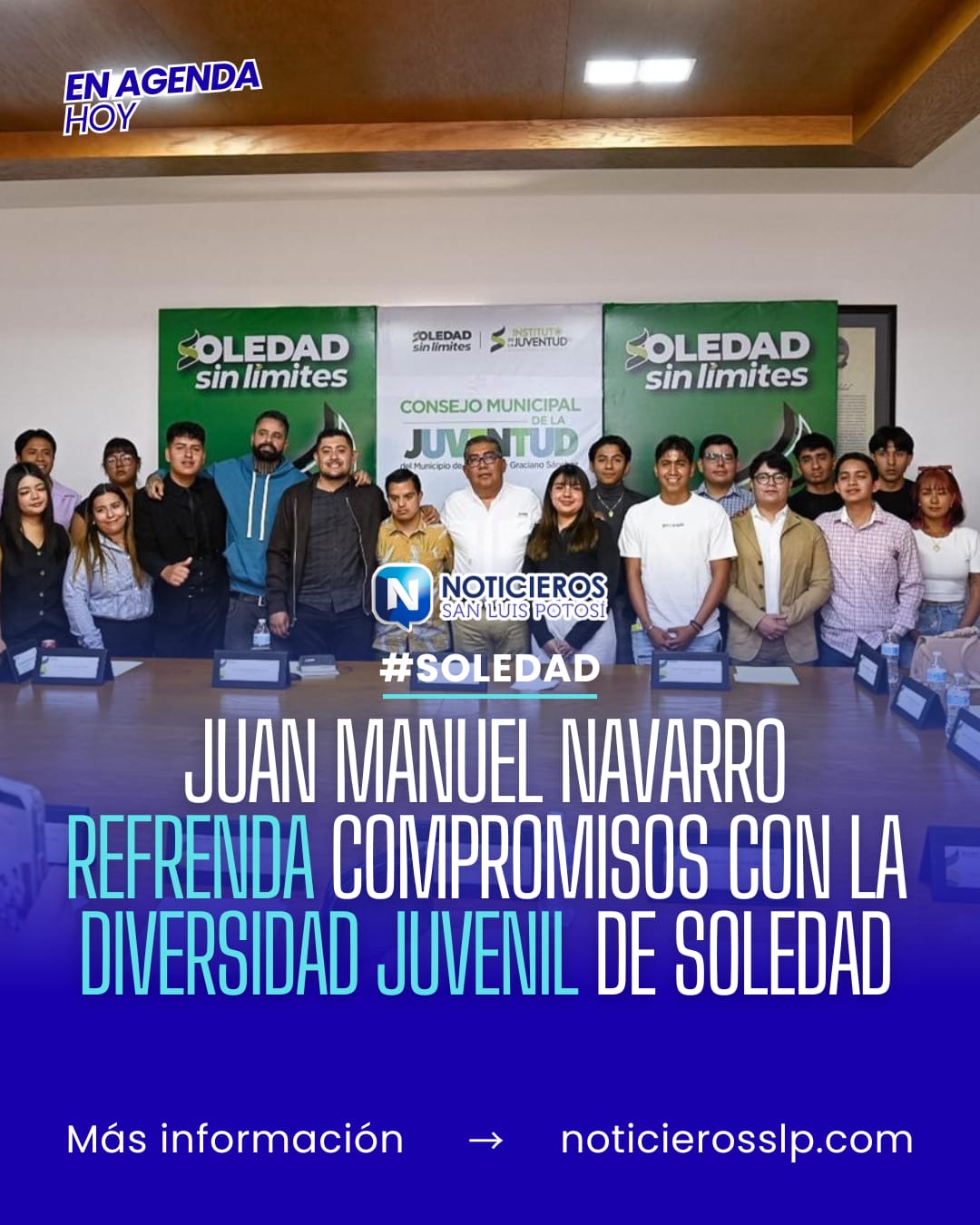 El presidente municipal de Soledad de Graciano Sánchez, Juan Manuel Navarro Muñiz, sostuvo una reunión con veinte jóvenes recién nombrados como integrantes honoríficos del Consejo Municipal de la Juventud. Durante el encuentro, el alcalde estableció un compromiso de respaldo institucional para el desarrollo integral de este sector poblacional.