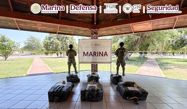 La Armada de México encabezó la operación durante labores de vigilancia marítima y aérea, asegurando 230 paquetes con aproximadamente 265 kilogramos de presunt…