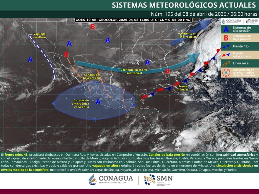 Según información de la Comisión Nacional del Agua (Conagua), las condiciones climáticas son ocasionadas por la presencia de una circulación anticiclónica ubicada en niveles medios de la atmósfera, en interacción con un canal de baja presión.