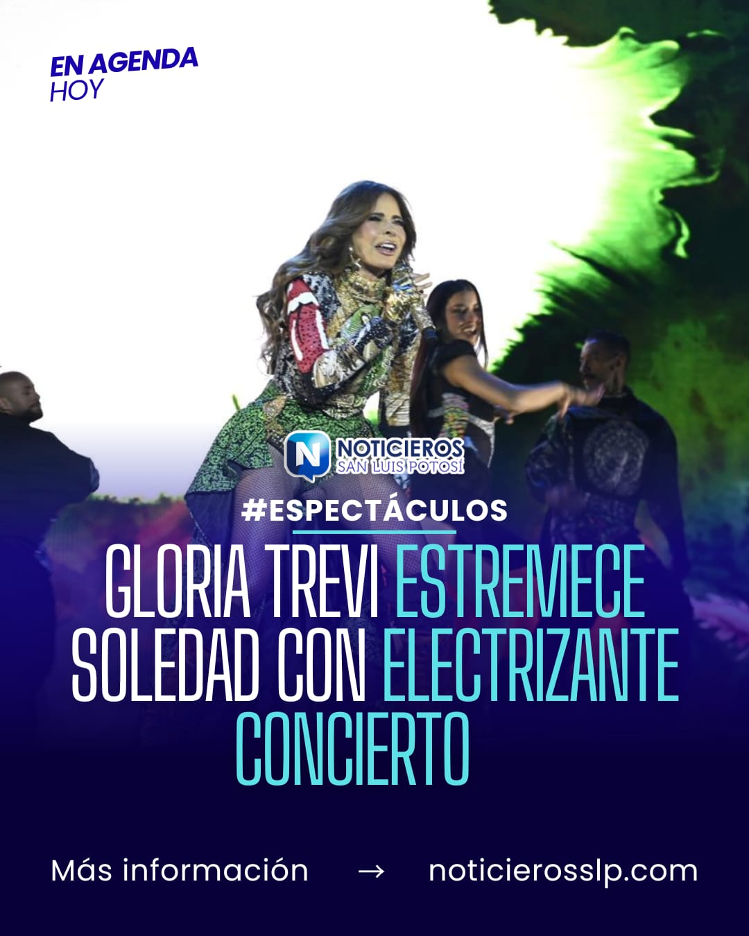La cantante Gloria Trevi se presentó en el Teatro del Pueblo de Soledad de Graciano Sánchez, San Luis Potosí, como parte de la cartelera de la Feria Nacional de la Enchilada (FENAE) 2026. El evento congregó a un numeroso público que abarrotó el recinto.