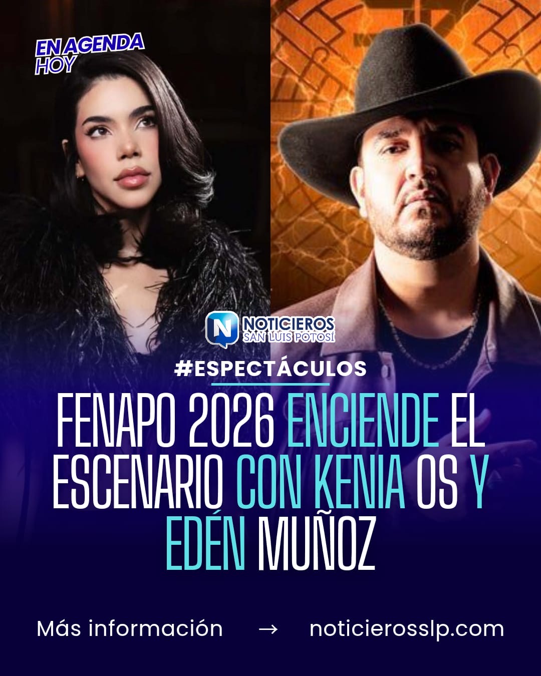 La Feria Nacional Potosina (Fenapo) 2026 ha anunciado nuevos nombres para su cartelera musical, con la participación confirmada de la cantante Kenia Os en el Teatro del Pueblo y del solista Edén Muñoz en el Palenque. El anuncio fue realizado por el gobernador del estado, Ricardo Gallardo Cardona, quien destacó el carácter diverso de la oferta artística.