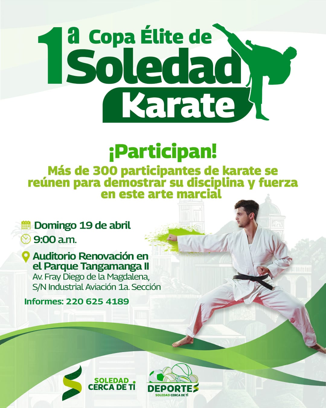 El municipio de Soledad de Graciano Sánchez realizará este domingo 19 de abril la primera edición de la Copa Élite de Karate, un evento deportivo organizado por la Coordinación de Deportes local. El torneo, que según las autoridades ha superado las expectativas de participación, está programado para iniciar a las 9:00 horas en el Auditorio Renovación del Parque Tangamanga II.