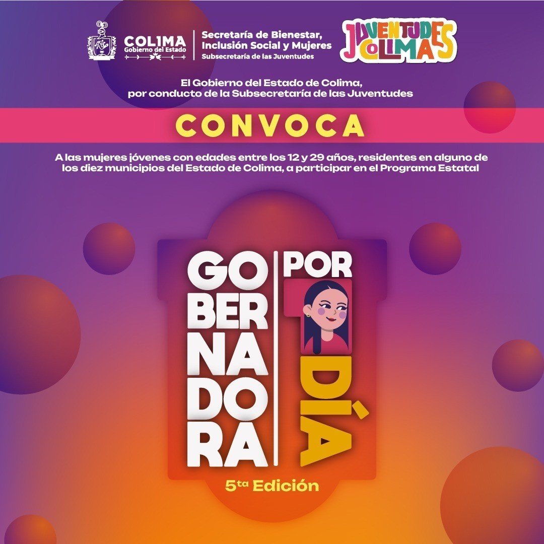 El Gobierno del Estado de Colima, a través de la Subsecretaría de las Juventudes (Subsejuv), ha emitido una convocatoria dirigida a niñas y mujeres jóvenes para participar en la quinta edición del programa 'Gobernadora por un Día'. La iniciativa, promovida por la administración de la gobernadora Indira Vizcaíno Silva, tiene como propósito fomentar la participación activa de este sector de la población en la vida pública estatal.