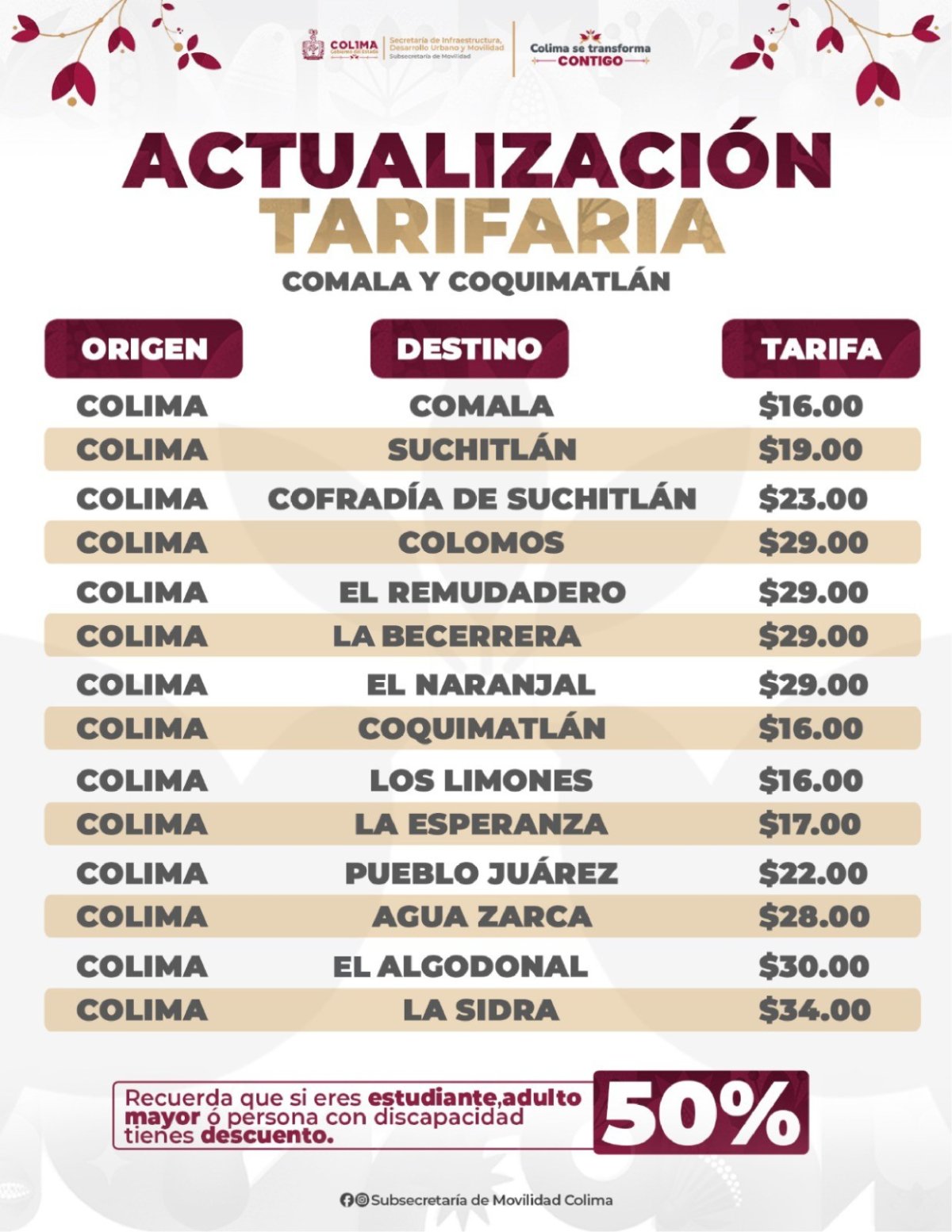 El ajuste tarifario aplicará específicamente para las rutas suburbanas de Comala y Coquimatlán a partir del lunes 20 de abril. La Subsemov aclaró que la ruta hacia Lo de Villa no sufrirá modificaciones y mantendrá sus tarifas actuales. Según la dependencia, esta decisión responde a la necesidad de garantizar la suficiencia operativa del servicio ante el incremento sostenido en los costos de insumos básicos y combustibles.