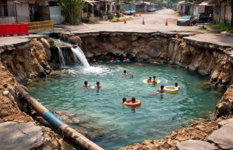 Vecinos de Acapulco utilizan socavón por fuga de agua como alberca improvisada